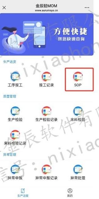SOP分為兩種:檢驗(yàn)SOP和加工SOP,檢驗(yàn)SOP在來(lái)料檢驗(yàn)單跳轉(zhuǎn),加工通過(guò)掃描工序計(jì)劃單進(jìn)行查詢;